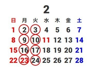 当店の営業日は下記カレンダー通りとなり、赤い丸が定休日となります。